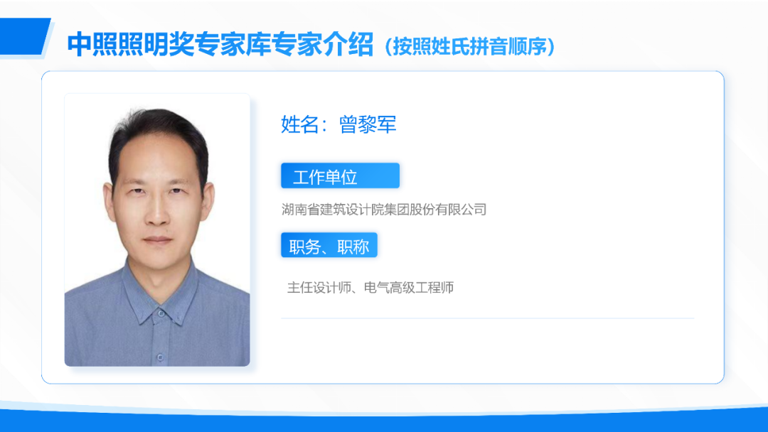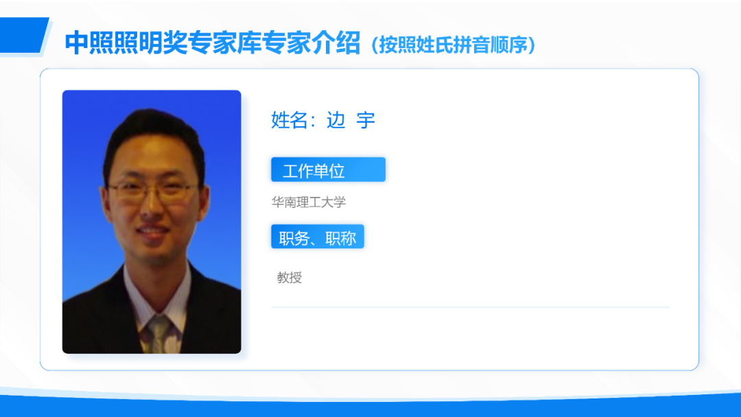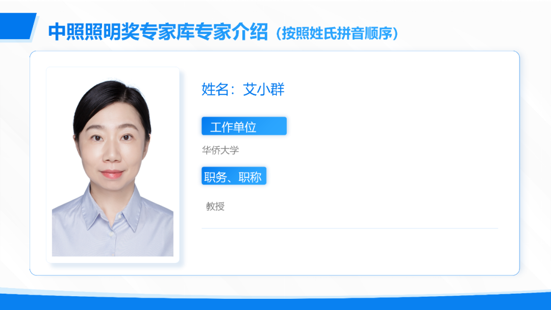 中照照明奖由中国照明学会于2005年设立,是中国照明领域经国家科学技术部批准,在国家科学技术奖励工作办公室登记的唯一奖项。为进一步规范中照照明奖的评审工作,充分体现评审的科学性、公正性、精准性和规范性。根据《中照照明奖奖励办法》有关规定,中国照明学会在2025年发布《关于推荐中照照明奖评审专家库增补专家人选的通知》,经公开征集、专家和单位推荐、形式审查、中国照明学会第八届理事会专家工作委员会审核,并报中国照明学会八届二十一次理事长办公会审定,增补艾小群等90人为中照照明奖评审专家库入库专家。现将增补入库专家分批次予以公布,第一批增补评审专家名单如下(按姓氏拼音排序)。